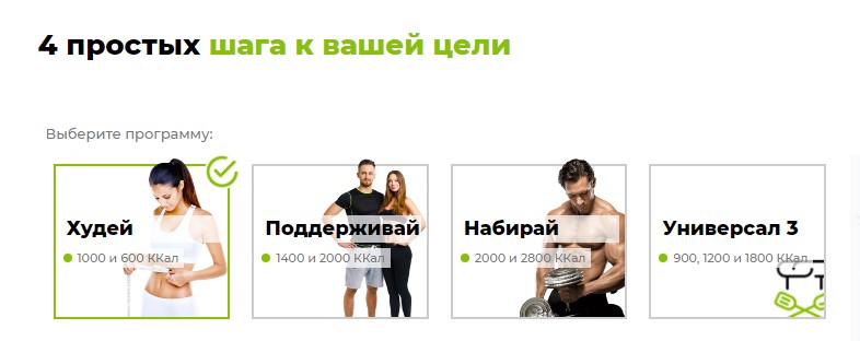 Предлагается семь готовых программ питания, включая четыре программы безопасного снижения массы. Для спортивного типа предусмотрено высококалорийное меню (2 500 и 3 500 ккал), помогающее наращивать мышечную массу и поддерживать тело в тонусе во время ежедневных тренировок. Также рекомендуется двухдневная детокс-программа из 16 смузи и овощных коктейлей для детоксикации организма.